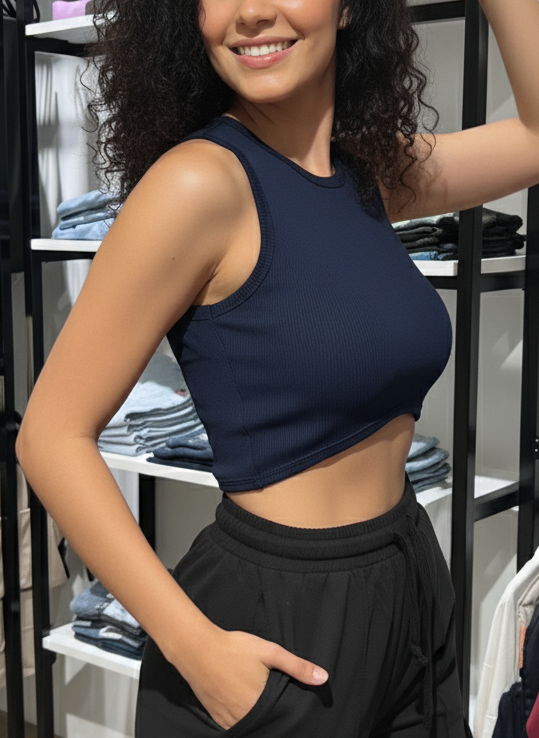 Descubre la versatilidad de nuestro Top Isla. Su diseño acanalado y corte contemporáneo lo convierten en el aliado perfecto para tus outfits del día a día, aportando un toque chic y confortable